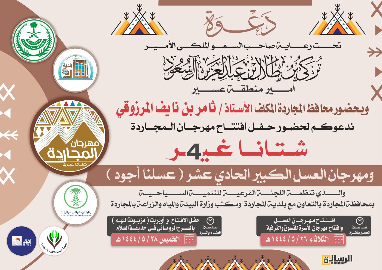 بموافقة ورعاية كريمة من سمو سيدي أمير منطقة عسير صاحب السمو الملكي الأمير تركي بن طلال- حفظه الله- وبحضور محافظ المجاردة المكلف الأستاذ ثامر بن نايف المرزوقي ستنطلق فعاليات مهرجان المجاردة لهذا العام تحت شعار ( شتانا غير ٤) والذي تنظمه اللجنة الفرعية للتنمية السياحية بمحافظة المجاردة بالتعاون مع الشريك الاستراتيجي بلدية المجاردة وكذلك مكتب وزارة البيئة والزراعة والمياه حيث سينطلق المهرجان بأولى فعالياته وهو مهرجان العسل الكبير الحادي عشر تحت شعار (عسلنا أجود) والذي يقام بصالة المعارض وسيكون ذلك يوم الثلاثاء الموافق ٢٦/٥/١٤٤٤ بعد صلاة العصر مباشرة وكذلك افتتاح مهرجان الأسرة للتسوق والترفيه كما سيقام الحفل الخطابي لافتتاح كافة فعاليات مهرجان المجاردة لهذا العام في المسرح الروماني بحديقة السلام بمحافظة المجاردة الساعة الثامنة مساءً من يوم الخميس الموافق ٢٨/٥/١٤٤٤ه، ويصاحبه أوبريت غنائي من كلمات الشاعر الحفظي شارع الشهري وأداء الفنان علي هادي والفنان أحمد الناشري وكذلك عروض الألعاب النارية والضوء والصوت من تقديم مؤوسسة تخيّر أكثر وتغطية إعلامية من قبل التلفزيون السعودي والقناة الإخبارية وقناة الوسام الفضائية ومؤسسة فنون تهامة وبرعاية من جمعية التنمية الأهلية ومؤسسة أفق لتنظيم المهرجانات وفندق أرض العسل.
