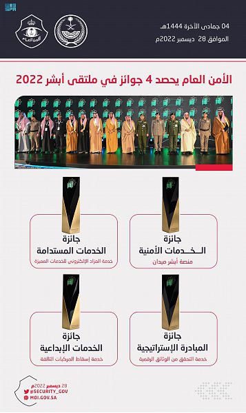 وتمثل الإنجاز في تحقيق جائزة الخدمة الأمنية “منصة أبشر ميدان” وجائزة الخدمات المستدامة “خدمة المزاد الإلكتروني للخدمات المميزة” وجائزة المبادرة الاستراتيجية “خدمة التحقق من الوثائق الرقمية” وجائزة الخدمات الإبداعية “خدمة إسقاط المركبات التالفة”.