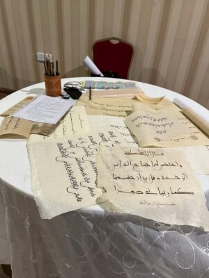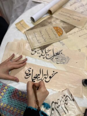 كما أبدعت الخطاطة أ. عائشة بالي والخطاطة د. نسرين التركي بركن الخط العربي بكتابة أسماء الراغبات من الحضور وسط جو ملئ بالبهجة والفرح .