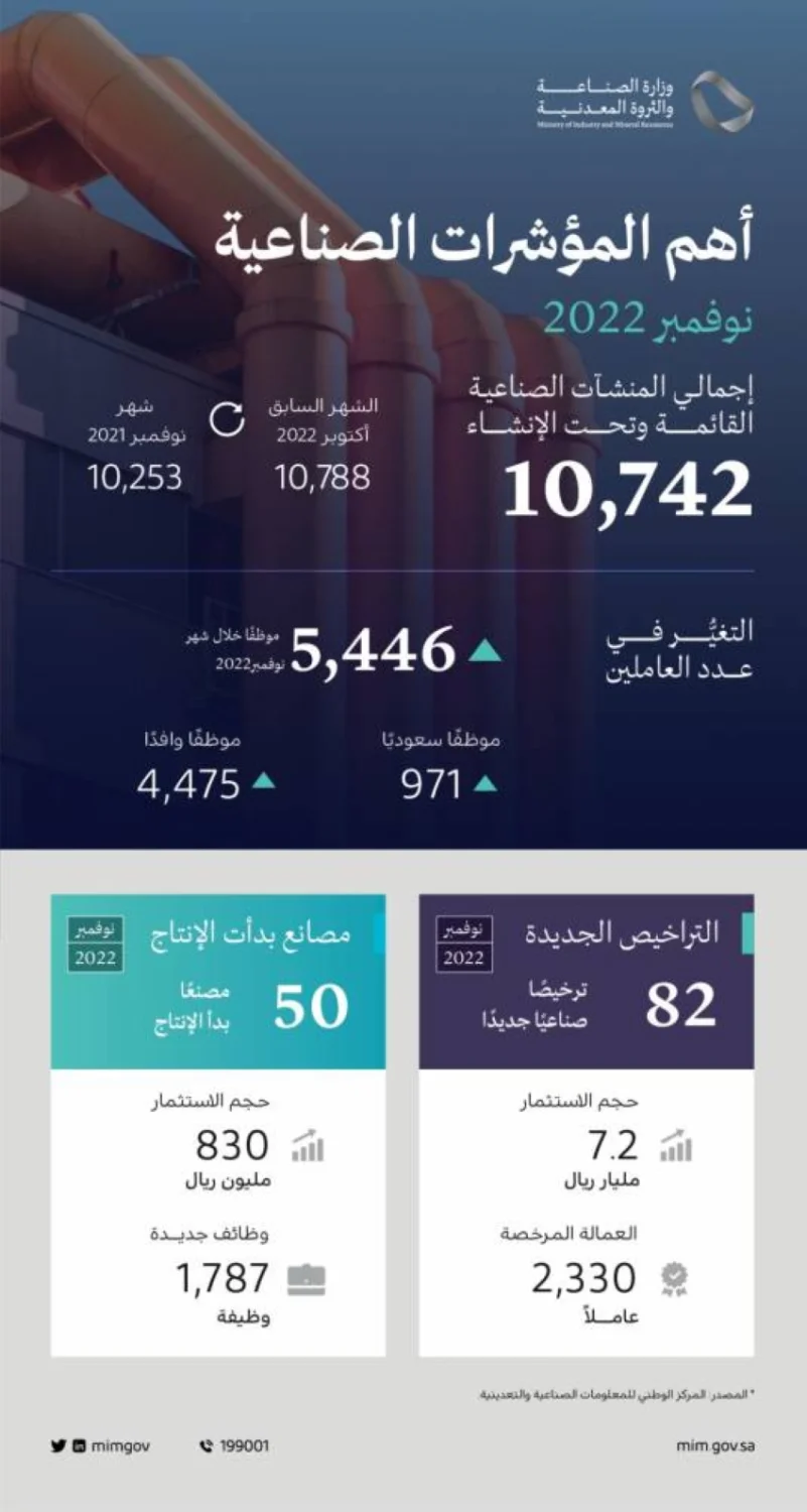 ترخيصاً، بينما وصل عدد المصانع القائمة في المملكة حتى نهاية الشهر نفسه 10742 مصنعاً، بحجم استثمارات بلغ 1.419 تريليون ريال.
