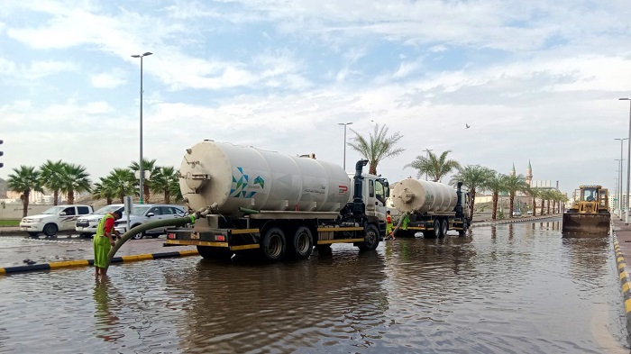 وخصصت الأمانة أكثر من 2500 معدة مختلفة، وتدار بواسطة عدد كبير من الفرق الميدانية المكونة من الكوادر البشرية والعمالة المدربة وتوزيعهم على مختلف المواقع خاصة التي يتوقع أن تشهد كثافة أعلى في هطول الأمطار للقيام بأعمال الإزالة والتنظيف وشفط المياه اولاً بأول، ولاتزال فرق الأمانة منتشرة في جميع الشوارع والميادين العامة خلال هذه الأيام وعلى مدار الساعة تحسباً للأمطار المتوقع هطولها خلال الأيام القادمة.