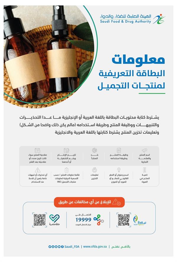 حددت الهيئة العامة للغذاء والدواء، المعلومات التي يُشترط وجودها في البطاقة التعريفية لمنتجات التجميل، مشيرةً إلى أنه يلزم كتابتها باللغتين العربية والإنجليزية، ما عدا التحذيرات والتنبيهات وتعليمات تخزين المنتج.