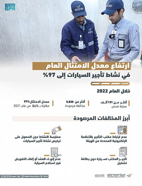 كشفت الهيئة العامة للنقل عن ارتفاع معدل الامتثال العام للمنشآت المرخصة في نشاط تأجير السيارات إلى 97% في عام 2022م مقارنة بـ 86% في العام الماضي 2021م.