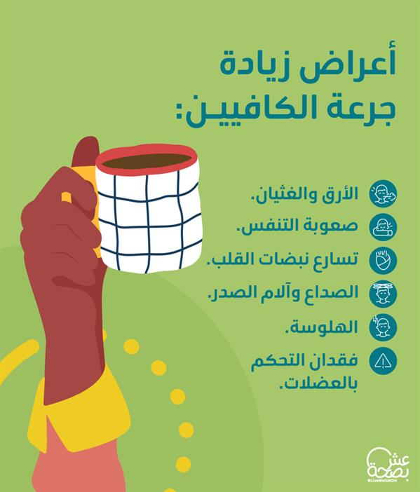 وأوضحت الوزارة أن من أعراض زيادة جرعة الكافيين، تسارع نبضات القلب، وصعوبة التنفس، والصداع، وحدوث آلام بالصدر.