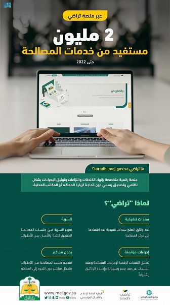 كشفت وزارة العدل، أن عدد المستفيدين من خدمات المصالحة عبر منصة تراضي الإلكترونية، بلغ أكثر من مليوني مستفيد، حتى نهاية عام 2022.
