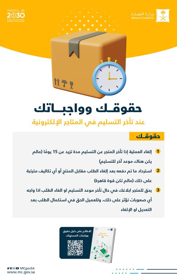 وأوضحت الوزارة أن يحق للعميل في حال تأخر وصول الطلب استرداد ما دفعه بعد إلغاء الطلب مقابل المنتج، أو أي تكاليف مترتبة على ذلك ما لم تكن قوة قاهرة.