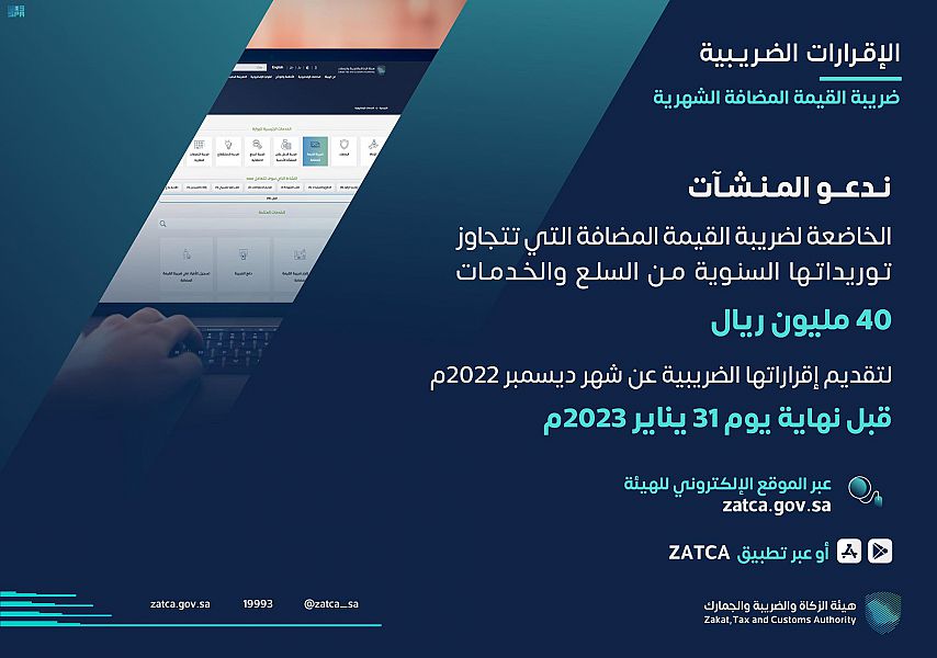 دعت هيئة الزكاة والضريبة والجمارك المنشآت من قطاع الأعمال الخاضعين لضريبة القيمة المضافة التي تتجاوز توريداتها السنوية من السلع والخدمات 40 مليون ريال إلى تقديم إقراراتهم الضريبية عن شهر ديسمبر الماضي والربع الرابع من عام 2022م، وذلك في موعدٍ أقصاه 31 من شهر يناير الجاري.