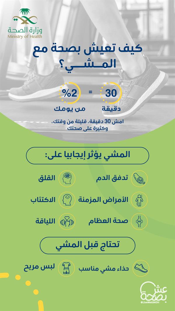 سلطت وزارة الصحة الضوء على فوائد المشي لمدة 30 دقيقة، مشيرة إلى أن هذه الدقائق تعد قليلة وتعادل 2% من يوم الفرد لكنها تؤثر بشكل إيجابي على صحته.
