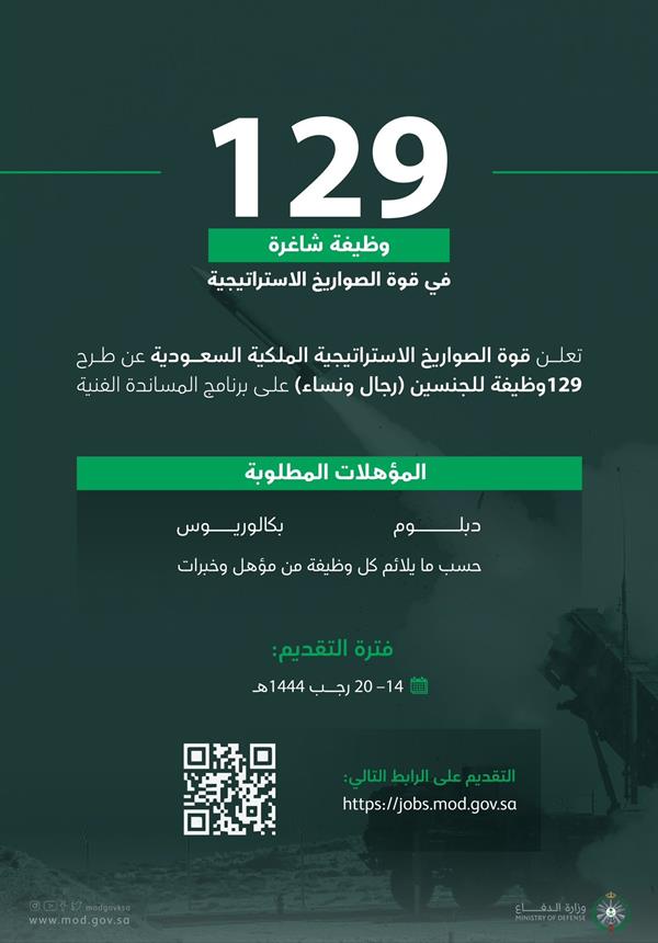 أعلنت وزارة الدفاع ممثلة في قوة الصواريخ الاستراتيجية الملكية السعودية، طرح 129 وظيفة للجنسين “رجال ونساء” على برنامج المساندة الفنية.