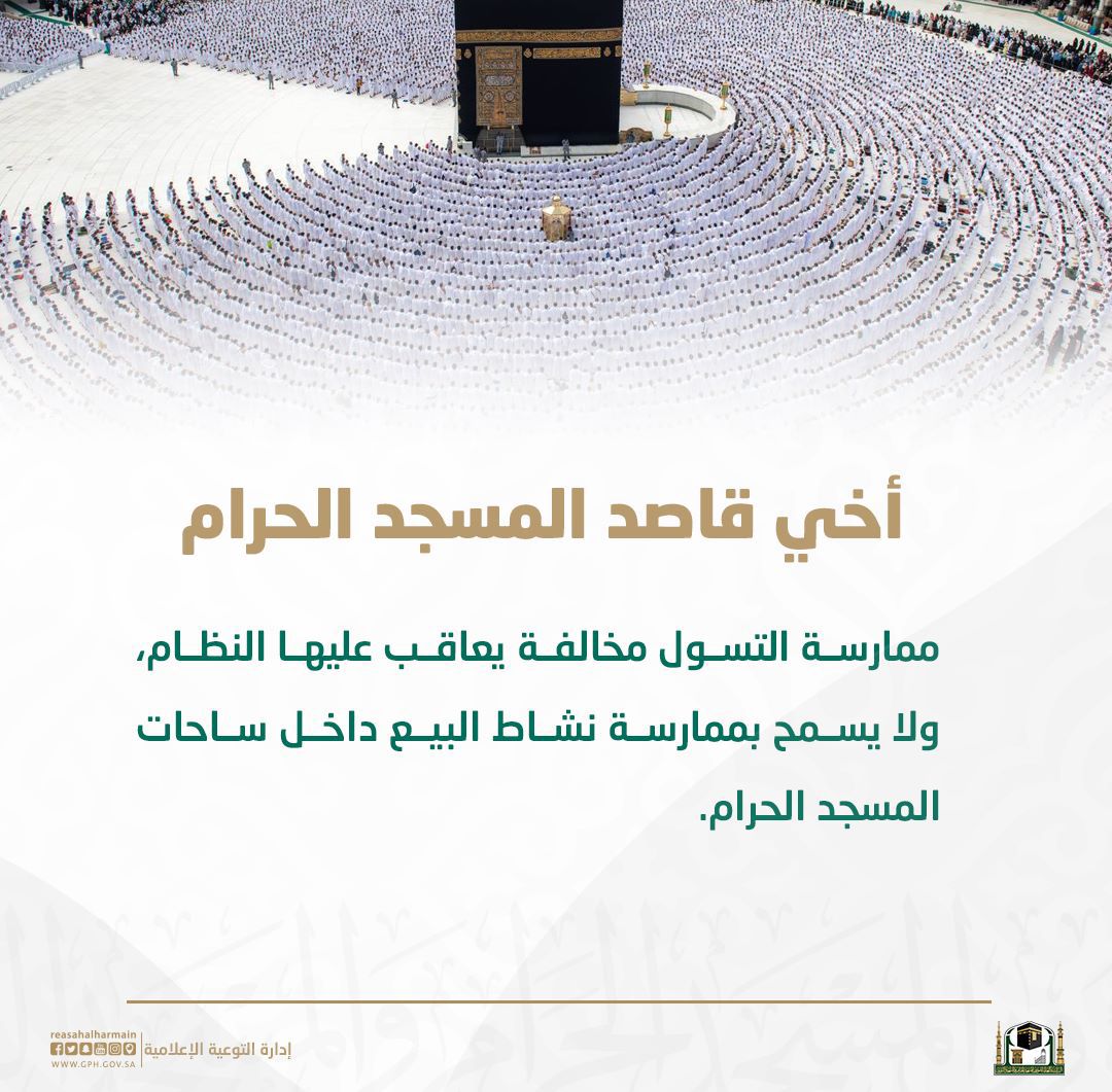 أكدت الرئاسة العامة لشؤون المسجد الحرام والمسجد النبوي، أن ممارسة التسول في المسجد الحرام مخالفة يعاقب عليها النظام.