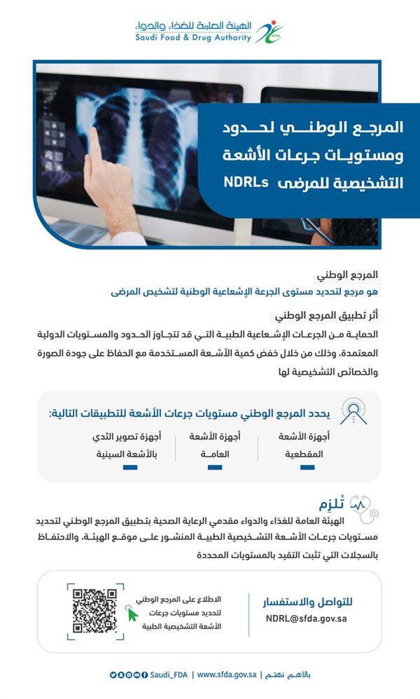 أوضحت الهيئة العامة للغذاء والدواء، الإجراءات التي يجب على مُقدم الرعاية الصحية اتباعها لحماية المريض من الجرعات الإشعاعية التي تتجاوز المستويات المعتمدة، مشيرةً إلى أنه ملزم باتباع المرجع الوطني لحدود ومستويات جرعات الأشعة التشخيصية للمرضى (NDRLs).
