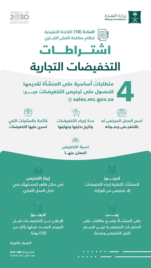 ولفتت إلى أنه لا يجوز للمنشآت التجارية إجراء التخفيضات إلا بترخيص من الوزارة، ولا يجوز الإعلان عن التخفيضات قبل الموعد المحدد لبدئها بأكثر من 15 يوماً، كما يجب على المنشأة وضع بطاقات على المنتجات المخفضة تبين السعر (قبل وبعد التخفيض)، مع إبراز الترخيص في مكان ظاهر للمستهلك في داخل المحل التجاري.