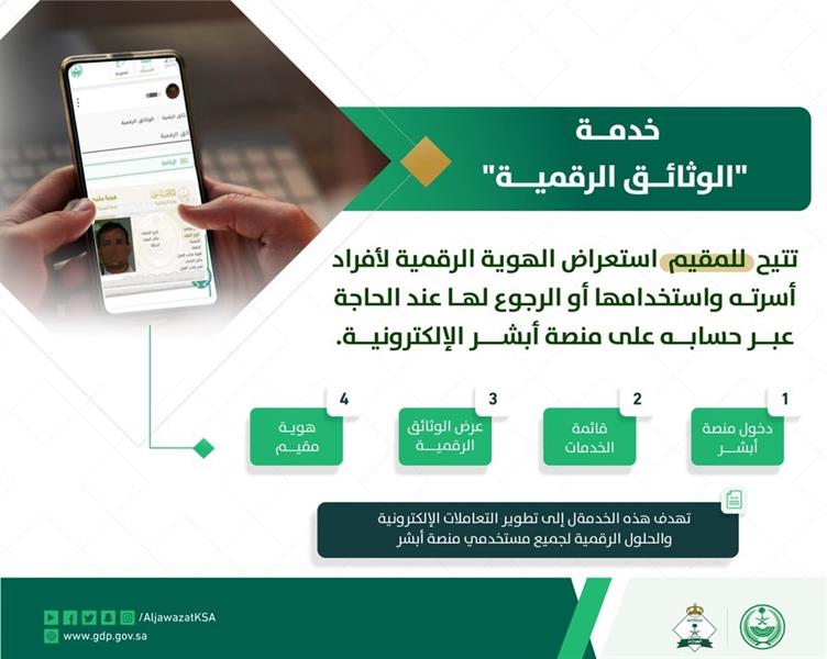 ولفتت إلى أن الخدمة تتيح للمُقيم استعراض الهوية الرقمية لأفراد أسرته واستخدامها، أو الرجوع لها عند الحاجة عبر حسابه في “أبشر”، مشيرةً إلى أنها تهدف إلى تطوير التعاملات الإلكترونية والحلول الرقمية لجميع المُستخدمين.