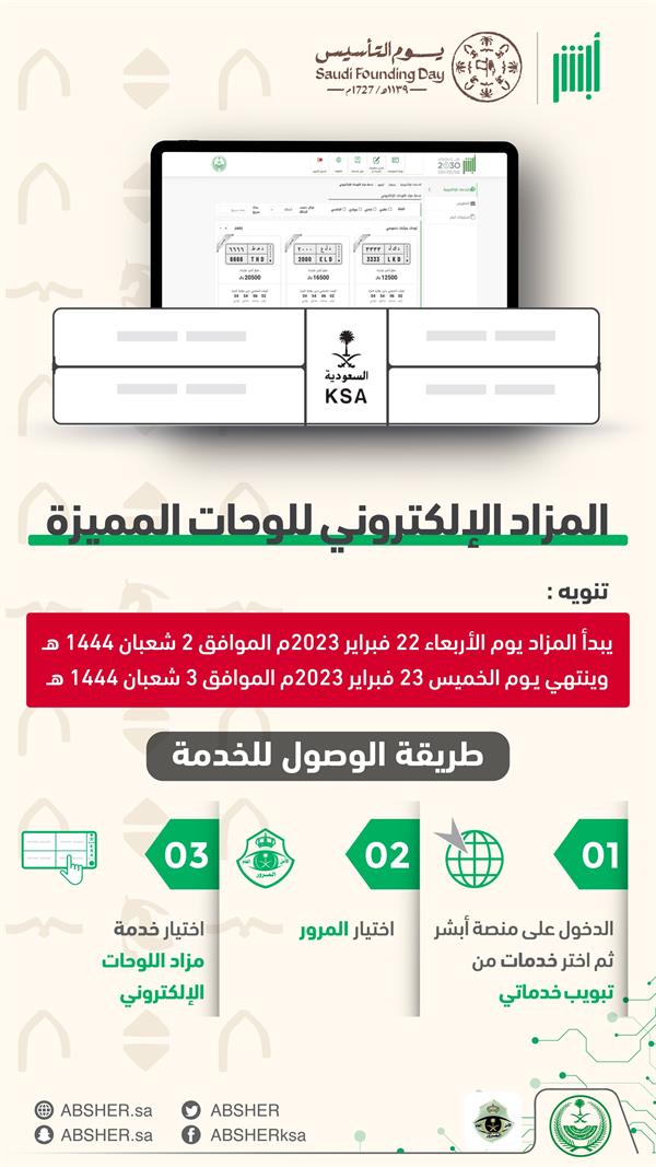 انطلق اليوم (الأربعاء)، مزاد اللوحات المميزة الإلكتروني الذي تقيمه الإدارة العامة للمرور عبر منصة “أبشر”.
