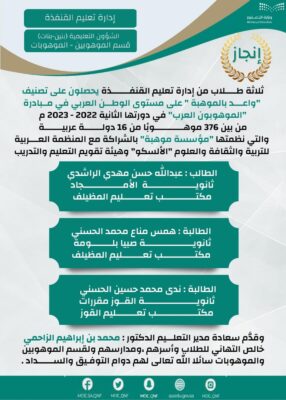 إنجاز جديد يحققه طلبة تعليم القنفذة، بحصولهم على تصنيف (واعد بالموهبة) في مبادرة (الموهوبون العرب) في دورتها الثانية2022م