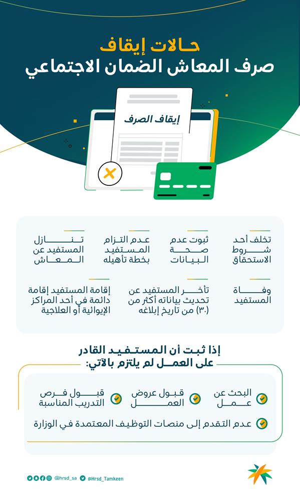 وأضافت أن صرف المعاش يتوقف أيضا عند تأخر المستفيد في تحديث بياناته الشخصية لمدة تزيد على 30 يومًا من تاريخ إبلاغه، وعند إقامة المستفيد إقامة دائمة في أحد المراكز الإيوائية أو العلاجية، وإذا ثبت أن المستفيد القادر على العمل لم يبحث عن عمل أو لم يقبل عروض العمل وفرص التدريب المناسبة، ولم يتقدم على منصات التوظيف المعتمدة في الوزارة.