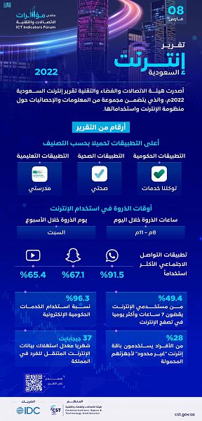أصدرت هيئة الاتصالات والفضاء والتقنية تقرير إنترنت السعودية 2022م، الذي يتناول أهم الأرقام المتعلقة بانتشار الإنترنت واستخداماتها في المملكة بالإضافة إلى مدى تطور البنية التحتية، وذلك بهدف رفع مستوى الخدمات الرقمية للقطاعين العام والخاص، وجذب الاستثمارات التقنية، الأمر الذي بدوره يساعد على بناء اقتصاد رقمي مزدهر.
