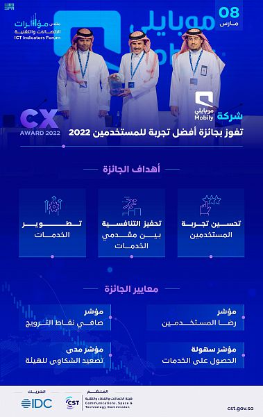 هيئة الاتصالات والفضاء والتقنية تعلن فوز موبايلي في جائزة أفضل تجربة للمستخدمين 2022