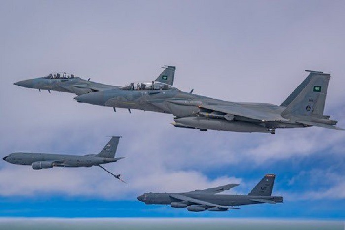 رافقت طائرتان من نوع “ف-15 إس أي” تابعتان للقوات الجوية الملكية، قاذفة القنابل الاستراتيجية “بي-52” التابعة للقوات الجوية الأمريكية.