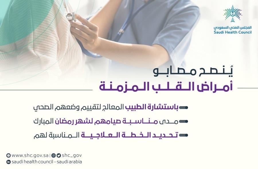 قدّم المجلس الصجي السعودي، مجموعة من الإرشادات والنصائح الطبية لمصابي أمراض القلب المزمنة قبل البدء بالصيام، تزامناً مع اقتراب حلول شهر رمضان المبارك.