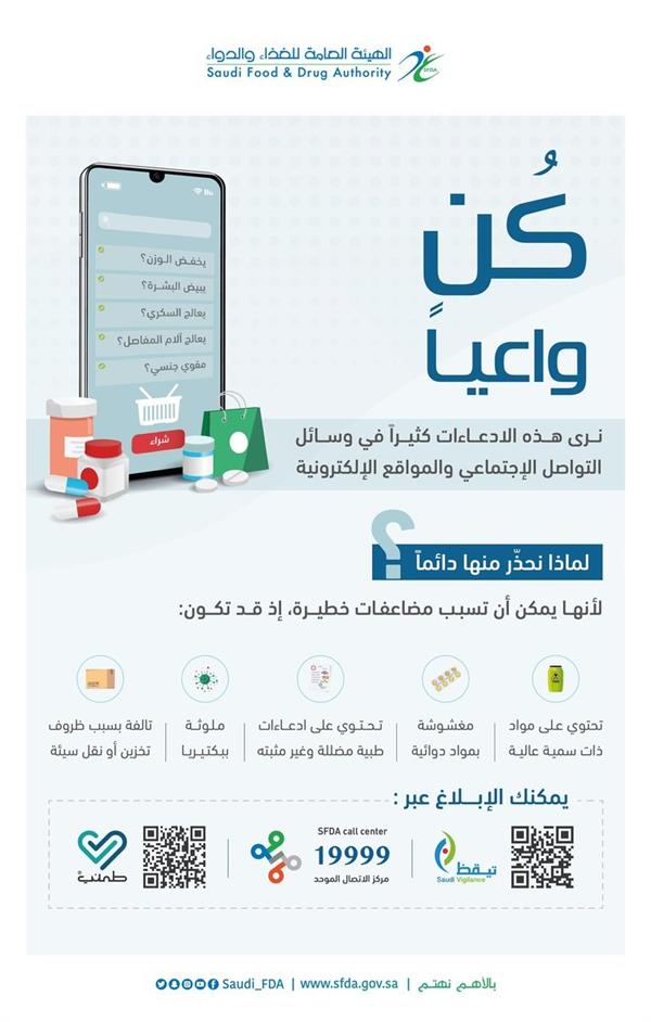كما دعت إلى توخي الحذر عند شراء هذه المنتجات عبر منصات التواصل الاجتماعي أو المواقع الإلكترونية؛ وقد تشمل الادعاءات المضللة قدرة المنتج على إنقاص الوزن أو تبييض البشرة أو علاج آلام المفاصل.