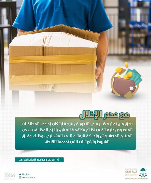 وأوضحت النيابة العامة أن هذه الأحكام تطبق بشرط عدم الإخلال بحق من أصابه ضرر في التعويض نتيجة ارتكاب إحدى المخالفات المنصوص عليها في نظام مكافحة الغش التجاري.
