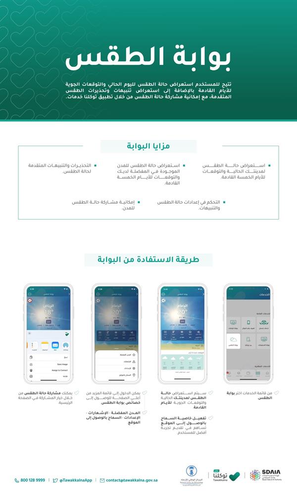 ودعا التطبيق الراغبين في الاستفادة من هذه الخدمة إلى الدخول إلى تطبيق “توكلنا خدمات” ثم اختيار “بوابة الطقس”، وحينها سيتم استعراض حالة الطقس لمدينة المستفيد والتوقعات الجوية للأيام القادمة، كما يمكن مشاركة حالة الطقس من خلال خيار المشاركة في الصفحة الرئيسية.