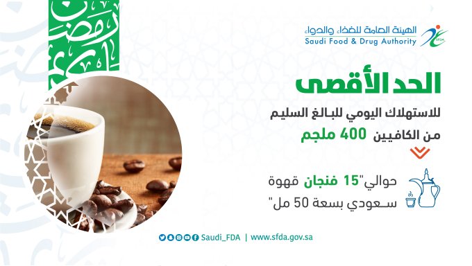 أوضحت الهيئة العامة للغذاء والدواء أن الحد اليومي للفرد البالغ السليم من الكافيين لا يزيد على 400 ملجم.
