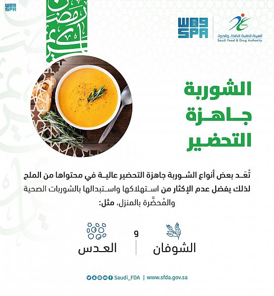 أوضحت الهيئة العامة للغذاء والدواء أن الشوربة تعد من الأطعمة المهمة والمفيدة في الموائد الرمضانية، بوصفها مصدراً جيداً للبروتينات والفيتامينات والألياف الغذائية.
