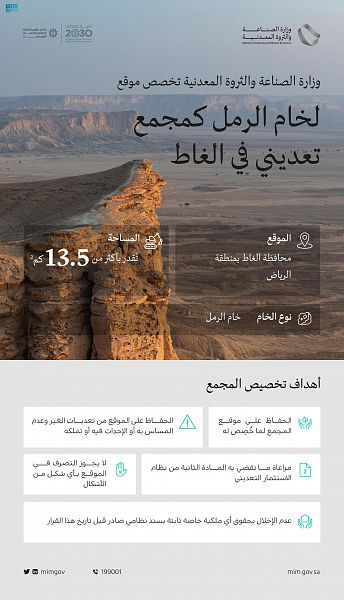 وزارة الصناعة والثروة المعدنية تخصص موقعًا لخام الرمل كمجمع تعديني بمحافظة الغاط