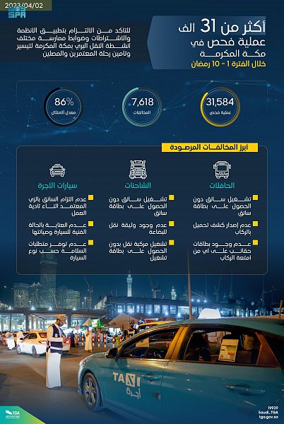 “هيئة النقل”: أكثر من 44 ألف عملية فحص في المدينة المنورة ومكة المكرمة خلال الأيام العشر الأولى من رمضان