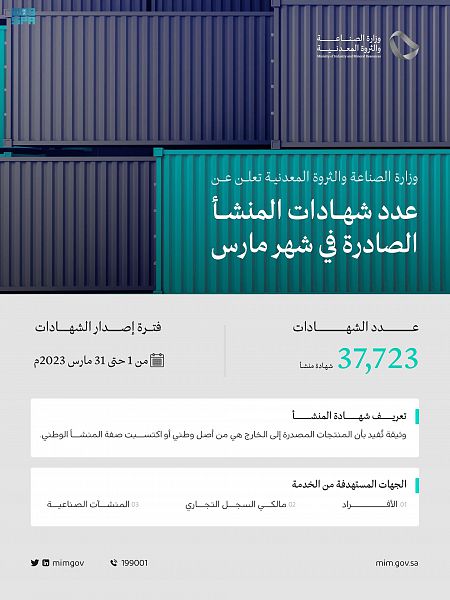 وأوضحت الوزارة أنه يمكن التقديم للحصول على شهادة المنشأ من خلال الموقع الإلكتروني للوزارة من خلال الرابط: https://coo.mim.gov.sa/