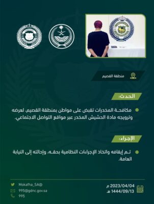 قبضت المديرية العامة لمكافحة المخدرات على مواطن بمنطقة القصيم، لعرضه وترويجه مادة الحشيش المخدر عبر مواقع التواصل الاجتماعي، وجرى إيقافه واتخاذ الإجراءات النظامية بحقه،وإحالته إلى النيابة العامة.
