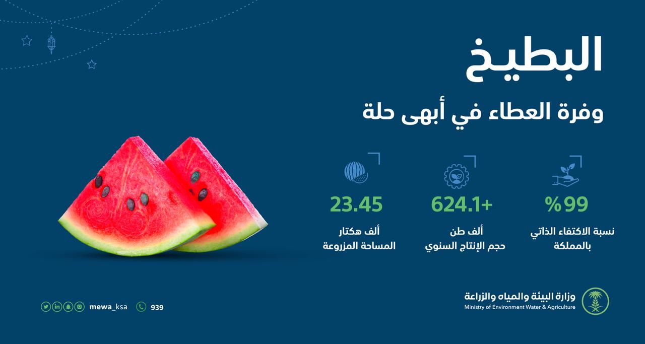 ‏ويزرع البطيخ في المملكة في موسمين هما سبتمبر ويغطي حماية من الصقيع، وفي فبراير حتى نهاية مارس ويتم جني محصوله بعد 90 إلى 120 يومًا، ويزرع في معظم مناطق المملكة، ومن أهم المناطق إنتاجًا الرياض الجوف، حائل، مكة المكرمة، القصيم، وجازان، ومن الفوائد الصحية للبطيخ أنه يعد مصدرًا كبيرًا للفيتامينات ويقوي المناعة ويحمي الدماغ ويقي من أمراض القلب والسرطان ويحمي من الجفاف.