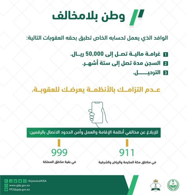 جددت المديرية العامة للجوازات، التذكير بعقوبة الوافد الذي يعمل لحسابه الخاص في إطار رسائلها التوعوية.