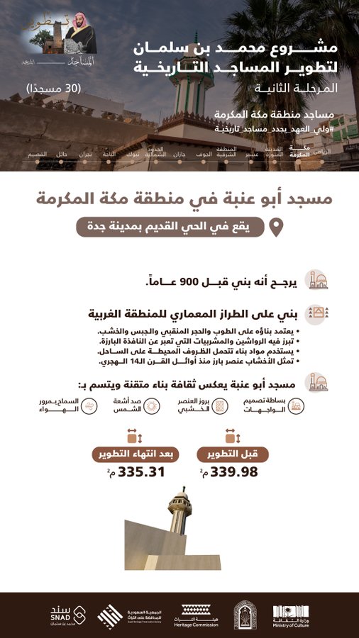 يحافظ مشروع الأمير محمد بن سلمان لتطوير المساجد التاريخية في مرحلته الثانية، على تراث عمراني تجاوز عمره 900 عام، من خلال تجديد مسجد أبو عنبة الواقع في محافظة جدة بمنطقة مكة المكرمة، والذي يرجح أنه بني قبل العام 544 هـ، في خطوة يهدف من خلالها المشروع إلى تعزيز الحضارة الإسلامية للمملكة وإعادة الحياة إلى مواقع كان لها أثراً تاريخياً واجتماعياً في تشكيل محيطها البشري والثقافي والفكري، واستعادة الدور الديني والثقافي والاجتماعي للمساجد التاريخية عبر المحافظة عليها.