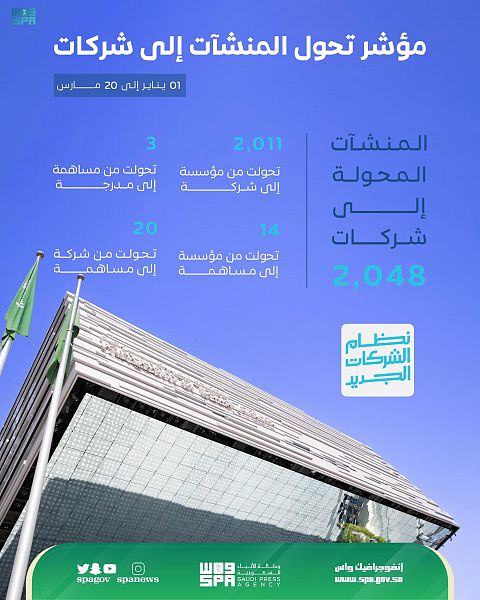 وأسهم النظام الجديد في تحويل 2048 منشآة، منها 2011 تحولت من مؤسسة إلى شركة وفق المعايير المحددة، كما تمكنت 20 شركة في التحول إلى شركة مساهمة، و14 مؤسسة من التحول إلى مساهمة و3 منشآت مساهمة إلى مدرجة خلال الربع الأول من عام 2023.