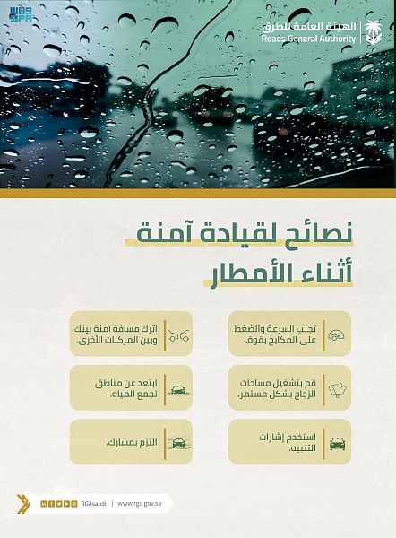 أوصت الهيئة العامة للطرق، قائدي المركبات بعددٍ من تعليمات السلامة أثناء القيادة في الأمطار، حيث أوصت الهيئة بتجنب السرعة والضغط على المكابح بسرعة، بالإضافة إلى أهمية ترك مسافة آمنة بين المركبات المجاورة، مع تشغيل مساحات الزجاج بشكل مستمر.