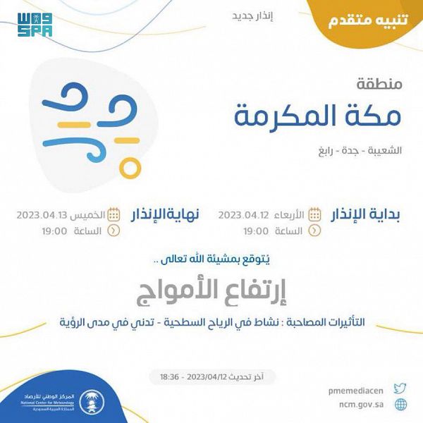 نبَّه المركز الوطني للأرصاد اليوم، من استمرار لحالة النشاط في الرياح السطحية المصحوبة بتدنٍّ في مدى الرؤية، وارتفاع الأمواج، تشمل تأثيراتها محافظتي جدة ورابغ وبحره والأجزاء الساحلية.