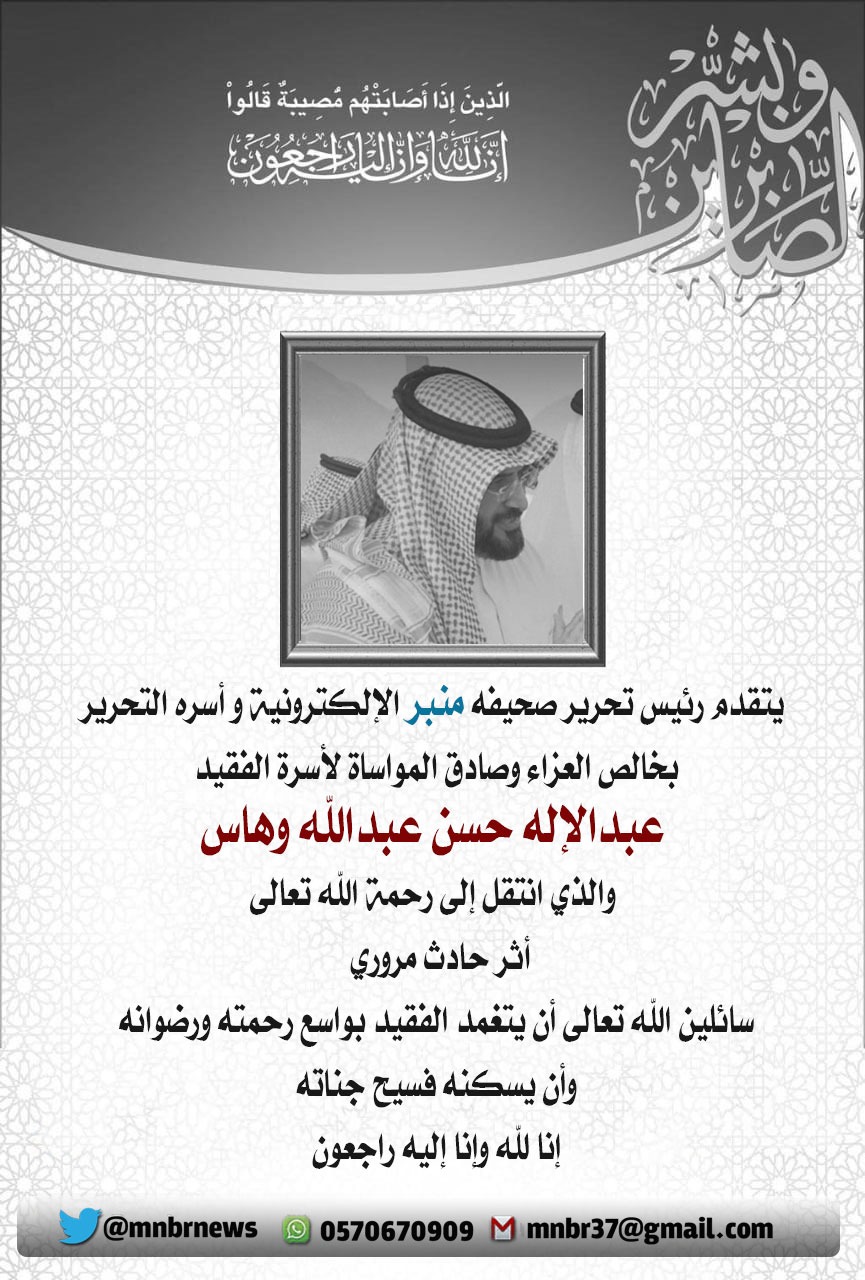 صحيفة منبر الإلكترونية وقد آلمها الخبر تتقدم بأحر التعازي وصادق المواساة لأسرة الفقيد سائلين الله تعالى أن يتغمده بواسع رحمته ورضوانه وأن يسكنه فسيح جناته. إنا لله وإنا إليه راجعون.