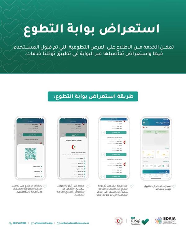 ولفت إلى أن خدمة استعراض بوابة التطوع تمكّن من الاطلاع على الفرص التطوعية التي تم قبول المستخدمين فيها، واستعراض تفاصيلها عبر البوابة في تطبيق “توكلنا خدمات”، مبيّناً طريقة وخطوات استعراض بوابة التطوع.
