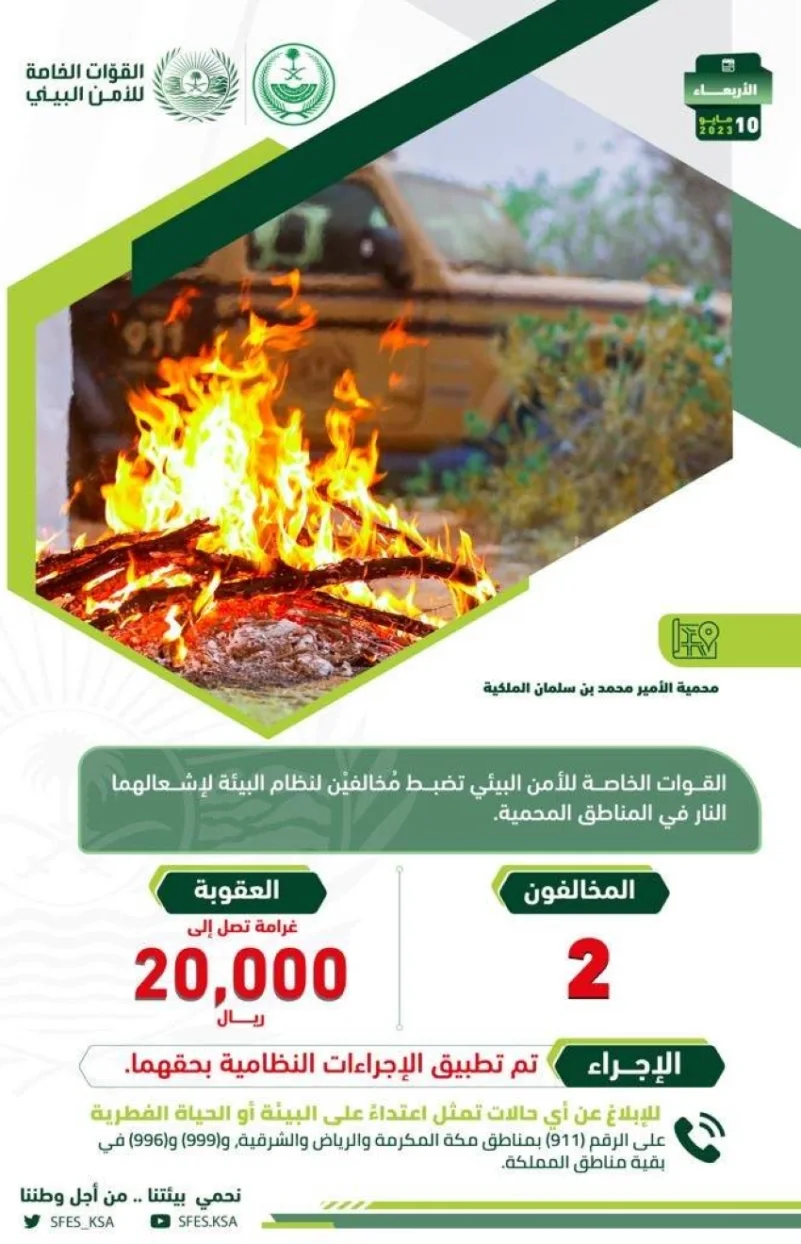 وأوضح المتحدث الرسمي للقوات الخاصة للأمن البيئي العقيد عبدالرحمن العتيبي، أنه تم تطبيق الإجراءات النظامية بحقهما، مؤكدًا أن عقوبة إشعال النار أو استعمالها في المناطق المحمية غرامة تصل إلى (20,000) ريال.