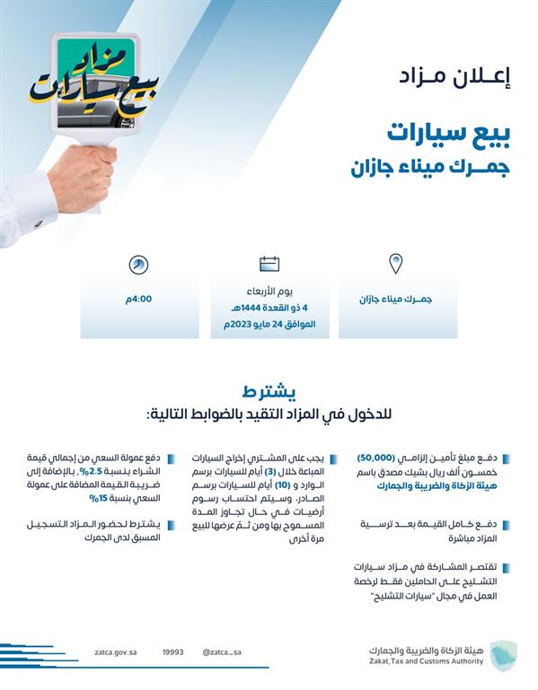 أعلنت هيئة الزكاة والضريبة والجمارك عن إقامة مزاد علني لبيع “سيارات” في جمرك ميناء جازان، وذلك يوم الأربعاء 4 ذي القعدة 1444هـ الموافق 24 مايو 2023م، وفق عدة ضوابط واشتراطات.