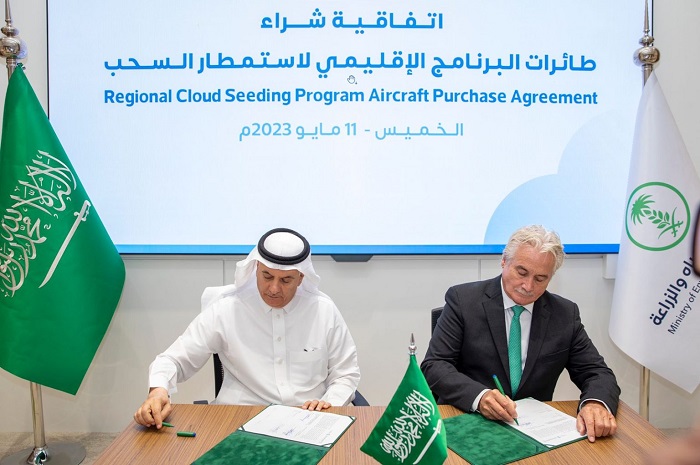 وقّع معالي وزير البيئة والمياه والزراعة رئيس مجلس إدارة المركز الوطني للأرصاد المهندس عبدالرحمن بن عبدالمحسن الفضلي اليوم، اتفاقية لشراء خمس طائرات لصالح البرنامج الإقليمي لاستمطار السحب؛ أربع منها مجهزة لعمليات الاستمطار، وطائرة خاصة لأبحاث ودراسات الطقس والمناخ، وتُعد هذه الطائرات الأحدث من نوعها ومجهزة بجميع التقنيات.
