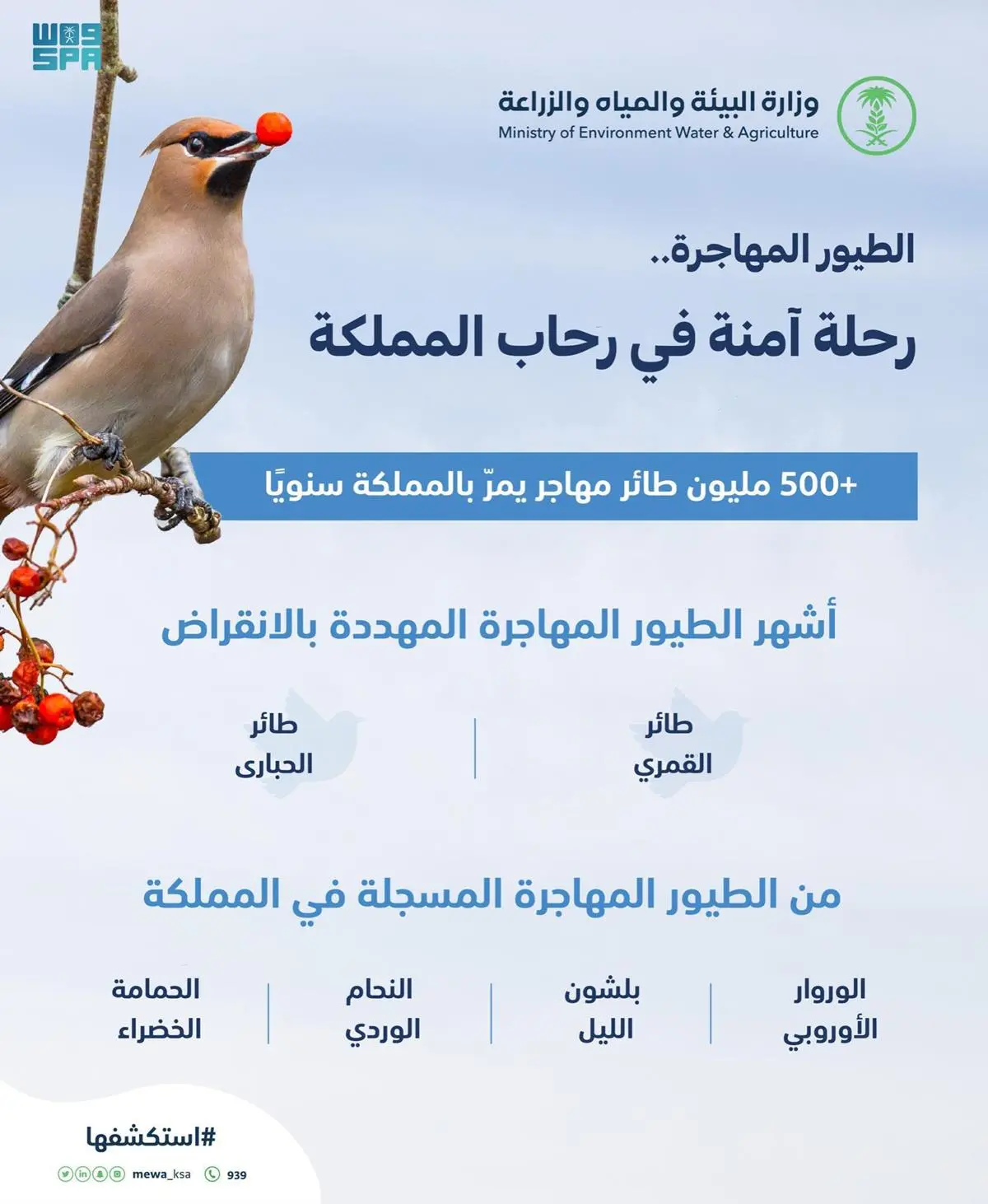 كشفت وزارة البيئة والمياه والزراعة عن مرور أكثر من (500) مليون طائر مهاجر سنويًّا فوق سماء المملكة، في رحلتها الموسمية طلبًا للغذاء.