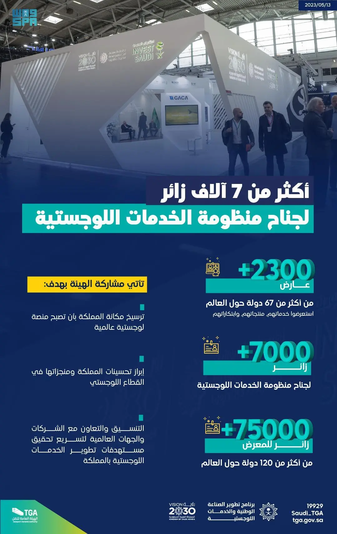 وشاركت الهيئة العامة للنقل في معرض لوجستيات النقل 2023 بالتعاون مع برنامج تطويـر الصناعــة الـوطـنـيـة والخدمات اللوجستية وذلك بهدف توظيف الموقع الجغرافي لرفع تقييم المملكة بالمؤشرات الدولية مثل مؤشر أداء الخدمات اللوجستية الصادر عن البنك الدولي (LPI)، وكذلك بناء التصور الذهني المطلوب لجعل المملكة منصة لوجستية عالمية كأحد أهداف رؤية المملكة 2030، بالإضافة إلى التنسيق والتعاون مع الشركات والجهات العالمية لتسريع تحقيق مستهدفات تطوير الخدمات اللوجستية بالمملكة، والتنسيق والتعاون مع الشركات والجهات العالمية لتسريع تحقيق مستهدفات تطوير الخدمات اللوجستية بالمملكة.