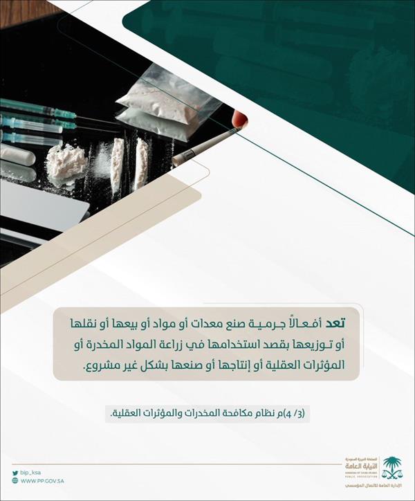 وأوضحت النيابة أن هذه الأفعال الجرمية تشمل: صنع مُعدات أو مواد أو بيعها أو نقلها أو توزيعها بقصد استخدامها في زراعة المواد المخدرة.