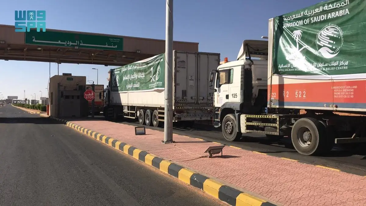 58 شاحنة إغاثية مقدمة من مركز الملك سلمان للإغاثة تعبر منفذ الوديعة متوجهة إلى عدة محافظات يمنية