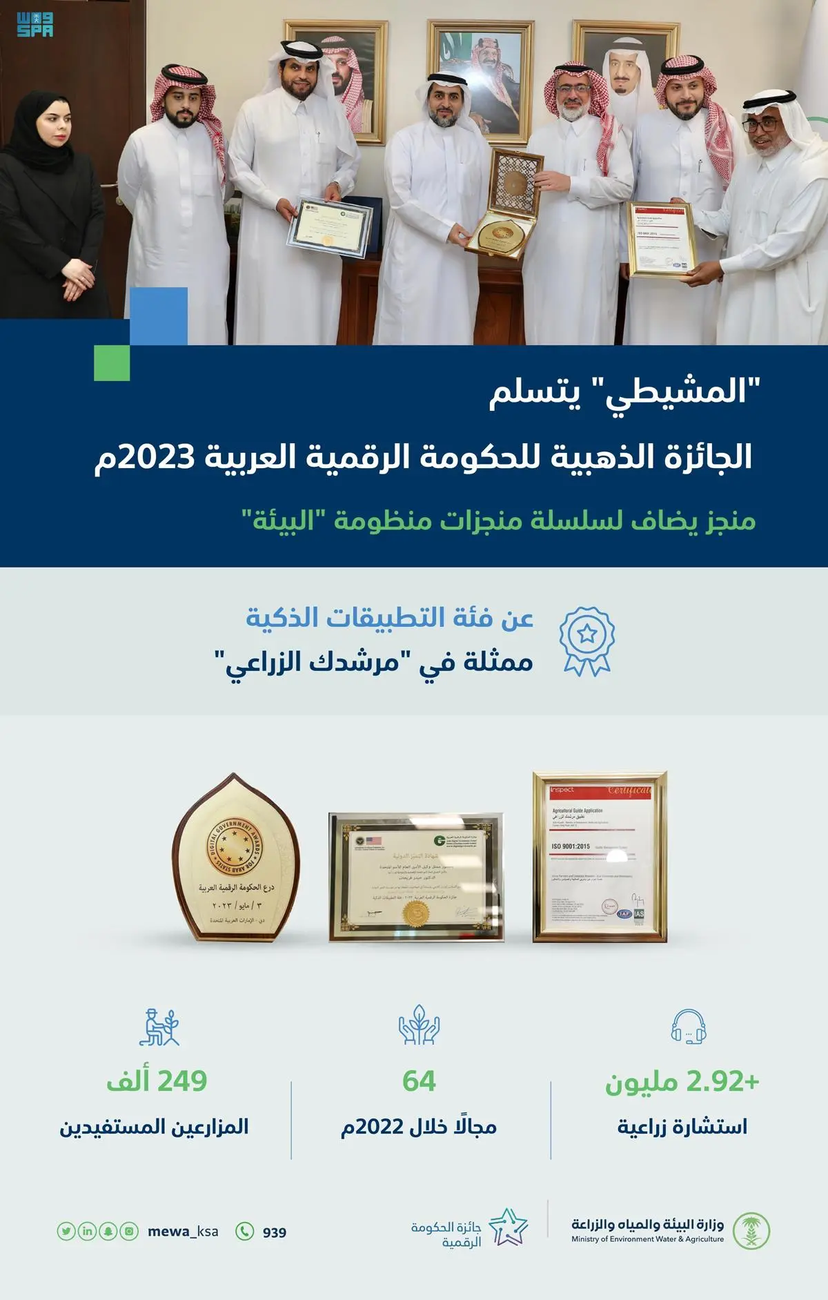 المملكة تحصد الجائزة الذهبية للحكومة الرقمية العربية لعام2023م عن تطبيق مرشدك الزراعي
