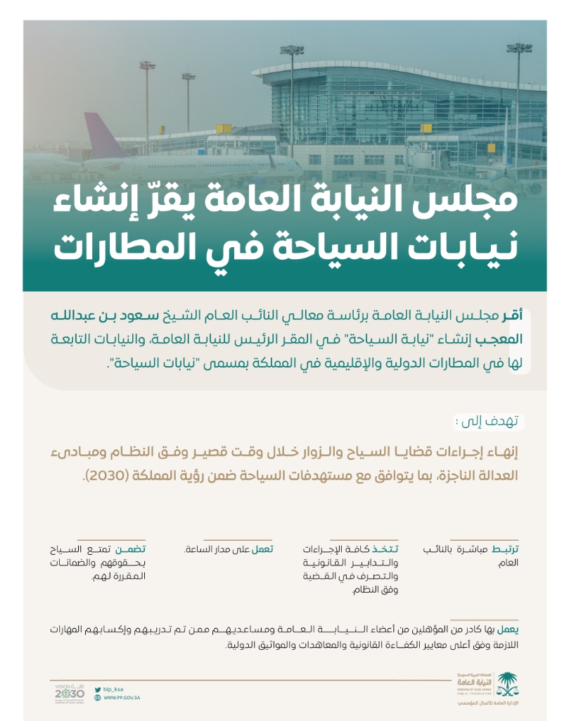 أقر مجلس النيابة العامة برئاسة معالي النائب العام الشيخ سعود بن عبدالله المعجب إنشاء “نيابة السياحة” في المقر الرئيس للنيابة العامة، والنيابات التابعة لها في المطارات الدولية والإقليمية في المملكة بمسمى “نيابات السياحة”.